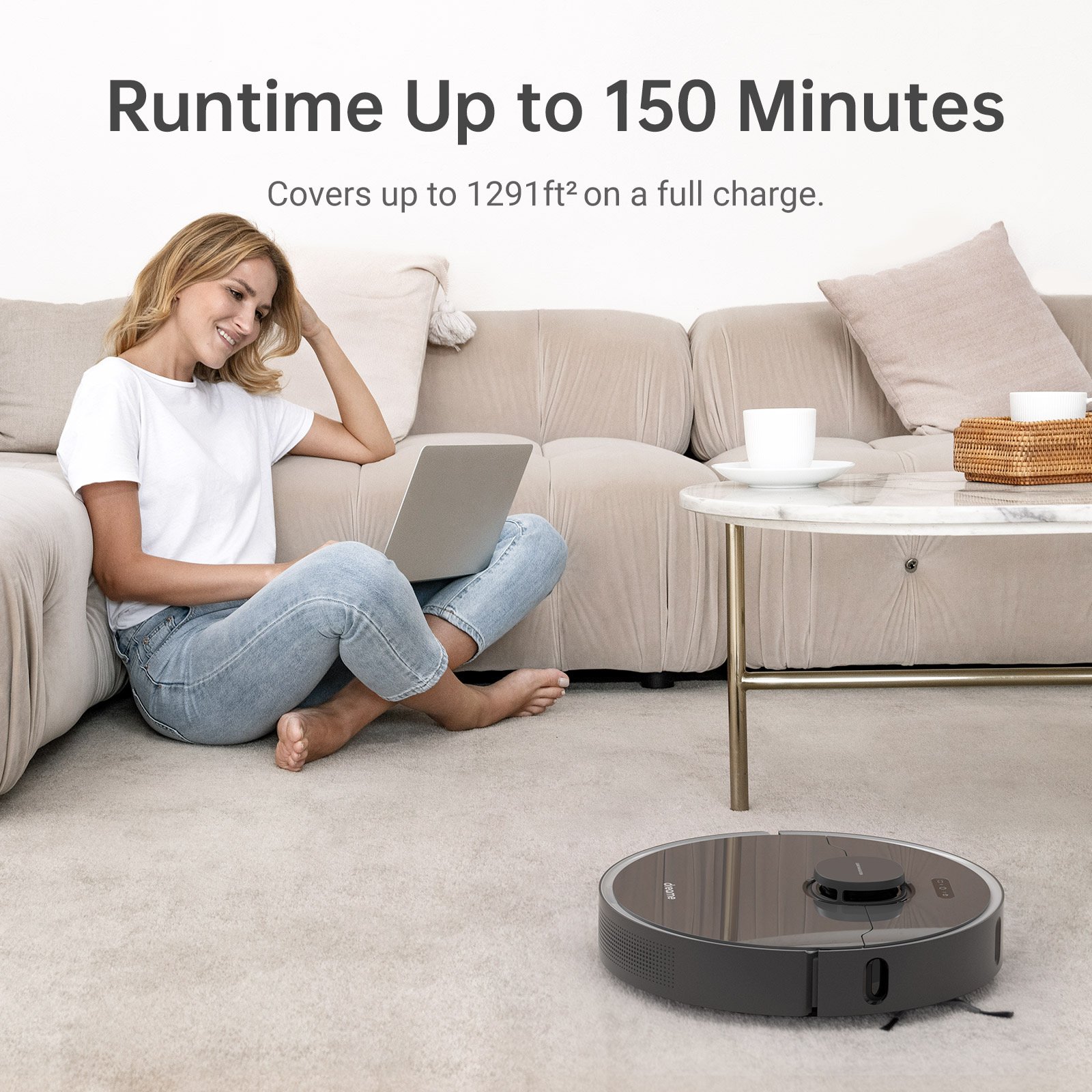 باتری داخلی قدرتمند 5200 میلی آمپری این محصول با یکبار شارژ 150 دقیقه کار کرده که این میزان برای نظافت 250 متر فضا کافیست. در صورت پایان شارژ باتری (رسیدن به 20 درصد ظرفیت)، ربات به طور خودکار به داکت شارژ بازگشته و پس از شارژ کامل به آخرین نقطه قبلی بازگشته و به کار خود ادامه می دهد.